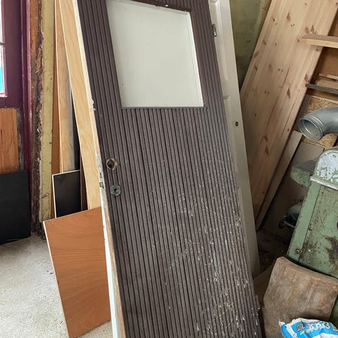 3st dörrblad med glas, 50-tal, mått ca 82x201,5cm, utan karmar. 1st med spanjoletthandtag. Pris per st.