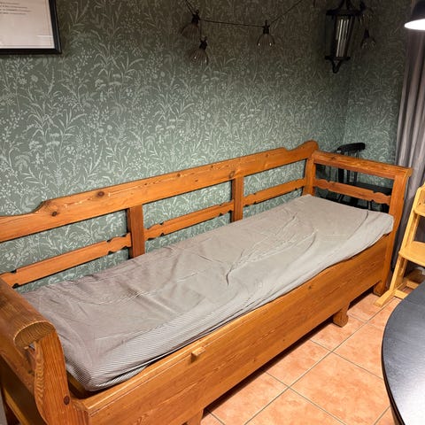 Soffan är stabil och i fint skick. Det enda är att sitsen behöver fixas, eftersom den har släppt.samt behöver kläs om. Lätt fixat, men tyvärr har vi inte tid pga. Renovering av hus.