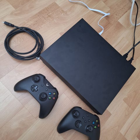 Microsoft Xbox One X spelkonsol 1 TB i svart. Konsolen är av typen Xbox One och levereras med originalkartong enligt bild.