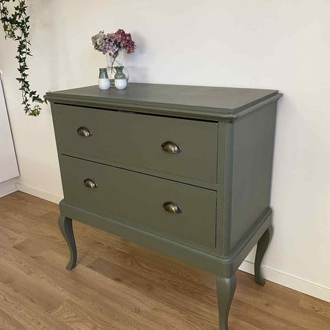 Lådornas botten är klädda i en tapet med citrommotiv och de gamla träknopparna är utbytta till rejäla hantag med antikguld-finish.