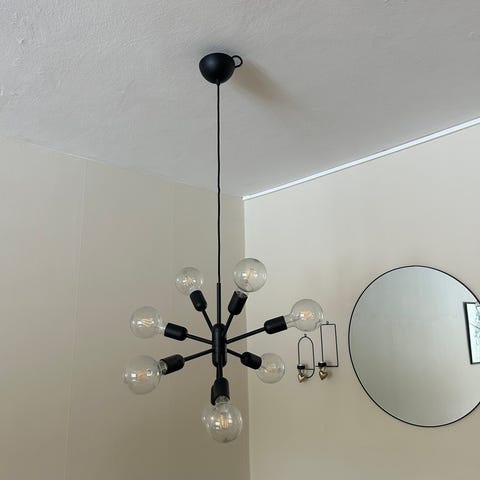 Svart taklampa med 8 armar. Mycket fint skick. Köpt från Clas Ohlsson ”sputnik”. Nypris 799. Säljes för 500 alla glödlampor ingår.
