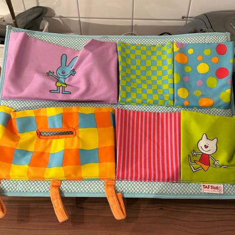 Perfekt för att hålla ordning på leksaker, böcker, surfplatta m.m. under bilresan. Flera praktiska fickor i olika storlekar och justerbara remmar för enkel montering runt nackstödet.
