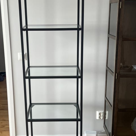 Ikeas vitrinskåp RUDSTA. Några repor på de svarta hyllplanen, i övrigt fint skick med fina glaspartier.