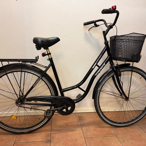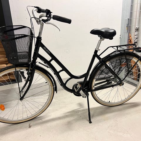 Svart cykel storlek 28. Går att växla till tre olika lägen. Utrustad med en korg framtill, fungerar fint som den ska.