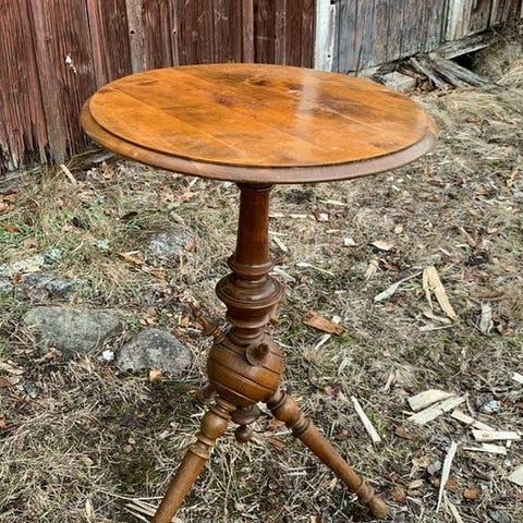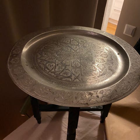 Runt brickbord i metall med lös bricka och vikbar underdel i trä. Brickan har vågad kant och tydlig patina. Underdelen består av svarvade ben som är hopkopplade med krysstag. Passar som sidobord eller soffbord i exempelvis vardagsrum eller uterum. Märke och exakt ursprung framgår inte, men det finns en stämpel på undersidan av brickan.