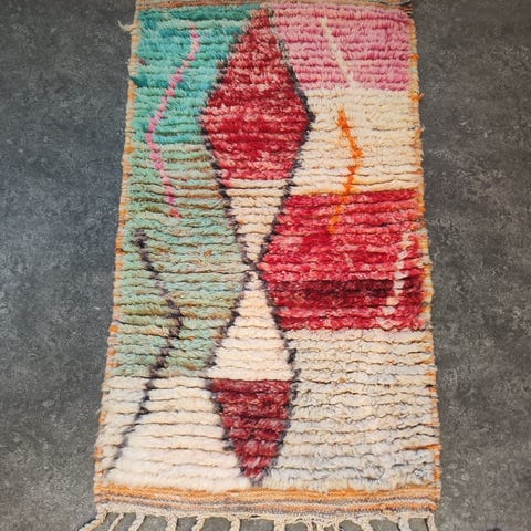 Boojaad-mattor är handvävda berbermattor från Atlasbergen i Marocko. De kännetecknas av mjuk ull, lekfulla färger och asymmetriska mönster som ofta skapas fritt utan förlagor. Resultatet blir unika, konstnärliga mattor med en bohemisk och varm känsla, perfekt som både inredningsdetalj och samlarobjekt.