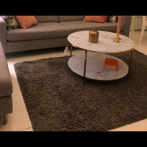 Matta i blå färg. Rektangulär modell som passar under soffa, soffbord eller i sovrum och vardagsrum. Mattan har en enfärgad yta med diskret struktur och är avsedd för inomhusbruk på hårda golv som trä eller laminat.
