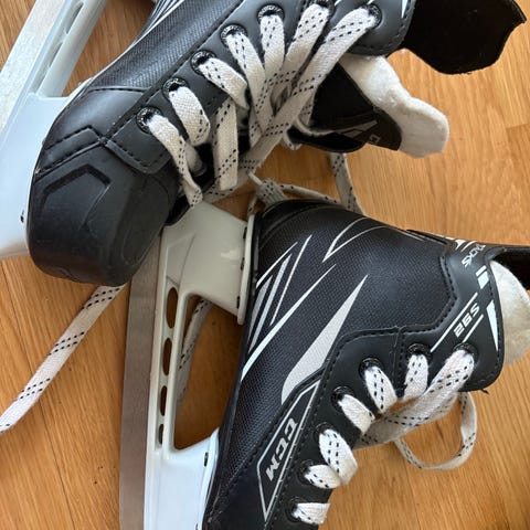 Ishockeyskridskor för barn i storlek 36. Skridskorna är svarta med vita detaljer och vita snören. Yttermaterial i syntet med klassisk snörning som ger justerbar passform.