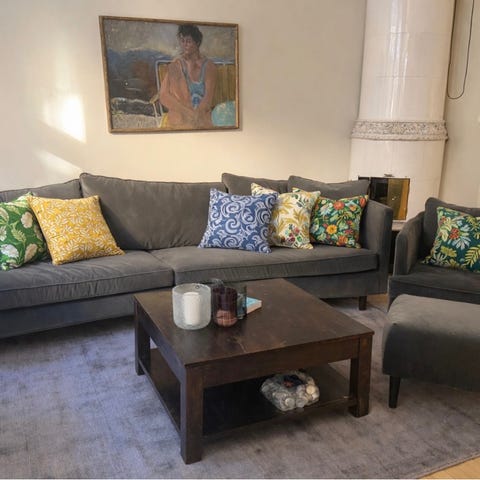 Tyget går smidigt att ta av för tvätt på samtliga dynor! Dock är klädseln på sittdynorna snart i behov av nytt tyg.