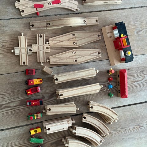 BRIO tågbaneset i trä med rälsdelar, broar och stationer av olika varianter och miljöer.