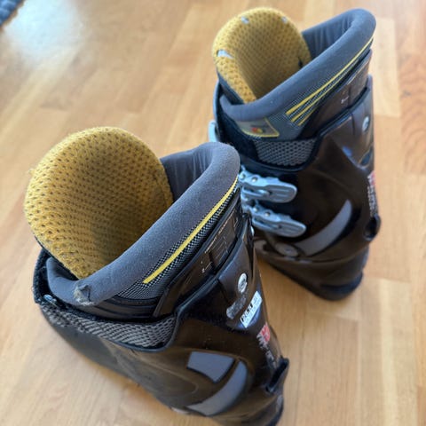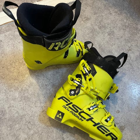 Fischer pjäxor i gul färg. Storlekssignering på sulan visar 255 mm mondopoint. Pjäxorna har fyra justerbara spännen i metall samt power strap upptill för bättre åtdragning runt benet. Invändig svart fodring för komfort. Passar för alpin skidåkning med standard alpina bindningar.