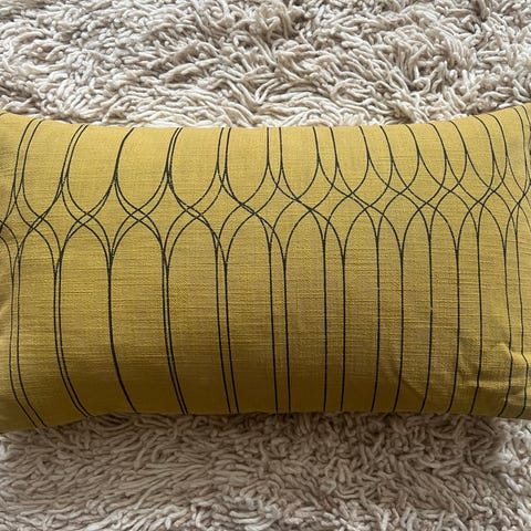 Kudde i blått tyg. Kudden har en formad design med knapp i mitten och avtagbart överdrag.