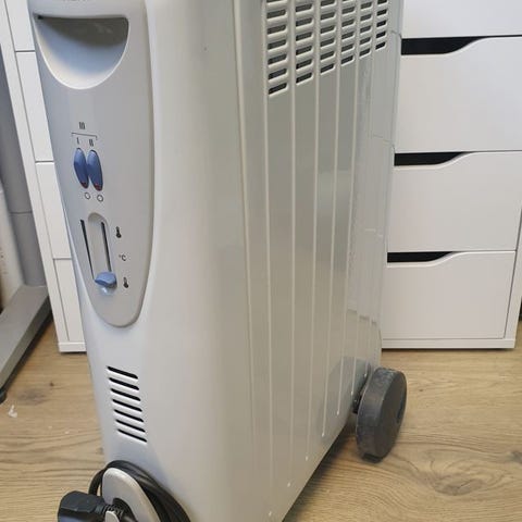 Elementet är ett portabelt, oljefyllt värmeelement med flera sektioner och hjul för enkel förflyttning. På framsidan finns manuell termostat och reglage för effektläge samt strömbrytare med indikatorlampor. Enheten drivs med 230V, 50Hz och har en effekt på 2000W enligt märkplåten.
