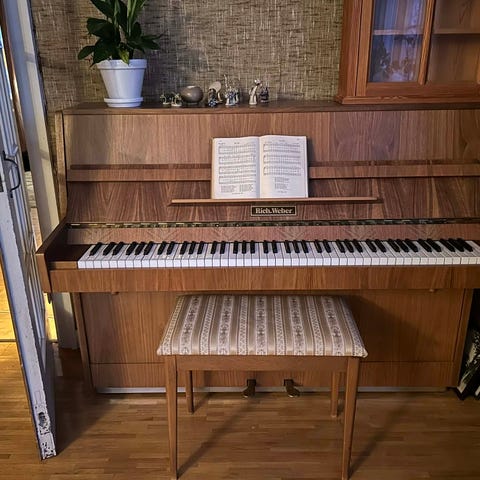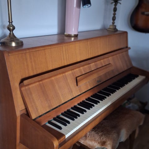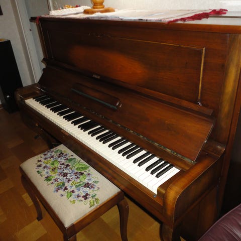 Upprätt akustiskt piano i träutförande. Pianot har fullstor klaviatur med vita och svarta tangenter samt traditionell notställning ovanför klaviaturen. Möbeln har klassisk design med profilerade ben. På bilden syns även en matchande pianopall med stoppad sits. Passar för hemmabruk, övning och musikspel i vardagsrum eller musikrum. Behöver stämmas. Finns i Jönköping. Köparen hämtar.