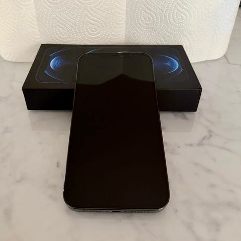 Apple iPhone 12 Pro mobiltelefon med 128 GB intern lagring. Modellen har trippelkamera på baksidan och frontkamera i skärmen. Fungerande telefon däremot skärm sprucken bak se foto och framskärmen ingen spricka men vit sträck på vänster sida som inte påverkar funktionen.