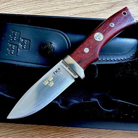 Stor och tung kniv med tillhörande slida. Ligger väldigt fint i handen och är perfekt för grövre jobb som skära kött hugga av ben och grenar.