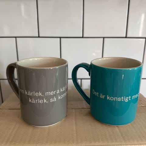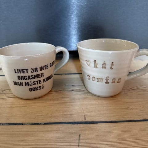 Kul muggar från Åhléns Home i vit keramik/porslin med affirmationstext på utsidan och insidan. Varje mugg har olika ord tryckta på sidan och text även på insidan i botten.