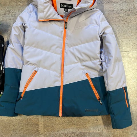 Marmot skidjacka och skidbyxor i flerfärgad design med gröna och gula partier. Jackan har huva, flera ytterfickor med dragkedja och knapp, samt snölås i midjan. Byxorna har hängslen, flera fickor och förstärkt nederdel vid benslut. Yttermaterial i vävt tyg med vadderad insida som ger värme vid skidåkning och vinteraktiviteter.