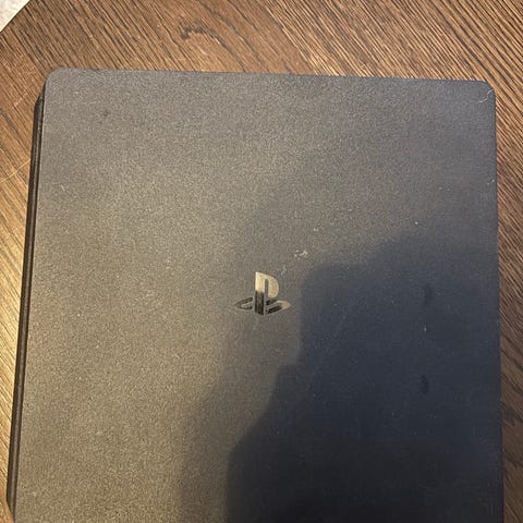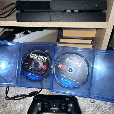 Sony Playstation 4 spelkonsol i svart färg med tillhörande trådlös handkontroll. På bilderna syns även flera fysiska PS4-spel i originalfodral, bland annat Watch Dogs och Call of Duty: WWII. Konsolen är avsedd för spel, film och annan underhållning via HDMI-anslutning till TV eller skärm. Passar för en eller flera spelare med stöd för extra handkontroller som kan köpas till separat.