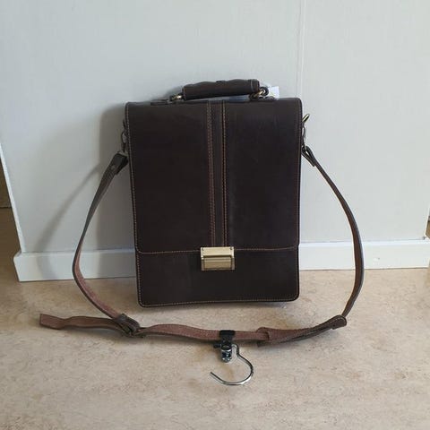En fin axelremsväska/portfölj i äkta läder. Perfekt till kontor eller skolan. Storlek ca 40x30cm. Rymmer laptop. På 15 tum.