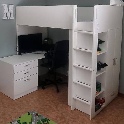 En mycket fräsch loftsäng med skrivbord och mycket förvaring.