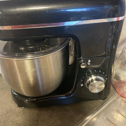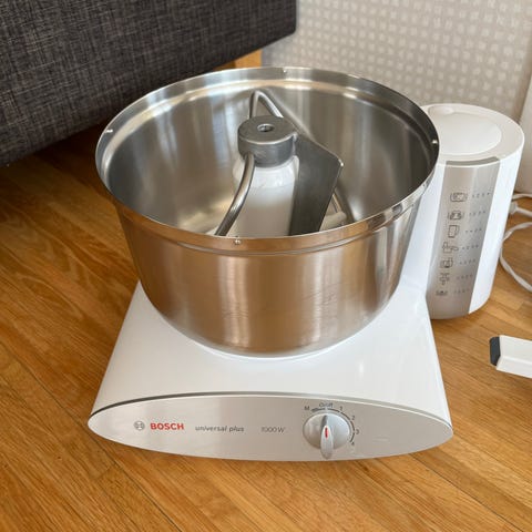 Bosch köksmaskin i vit färg. Maskinen har stor bunke och flera vispar/tillbehör för blandning och vispning. Utrustad med vred för hastighetsreglering på framsidan. Passar för matlagning och bakning i hemmet, till exempel för degar, smet och andra köksförberedelser.