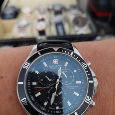 Swiss Military Patowa armbandsur med rund boett och mörk urtavla med arabiska siffror. Urtavlan har flera delvis markerade subdials för veckodag och andra tidsfunktioner. Boetten är i metall och baksidan är märkt med Swiss Military Hanowa och information om rostfritt stål. Klockan har svart läderarmband med ljus insida och kontrastsömmar samt klassiskt spänne. Passar som vardags- eller fritidsklocka.