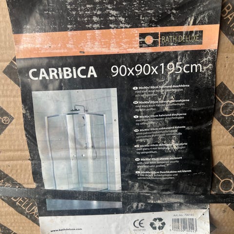 BathZone duschhörna med måtten 90 x 90 x 195 cm. Modellen har två böjda duschdörrar i rökt glas och profiler i metall. Hörnmodellen är avsedd för montering i badrumshörn och ger en avskärmad duschplats. Glaset är rökt för viss insynsskydd och en dämpad ljusgenomsläpplighet.