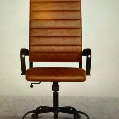 Kontorsstol med hög rygg i svart konstläder. Stolen har vadderad sits och rygg med horisontella sömmar, fasta armstöd med svart ovansida samt kromade detaljer. Underredet är i krom med fem ben och runda fötter. Passar för användning vid skrivbord eller arbetsplats i hem eller kontor.