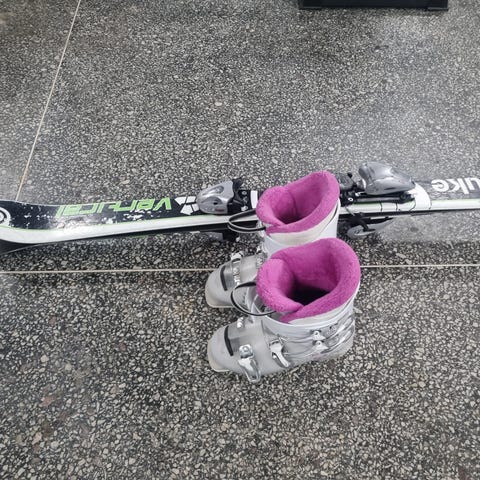 Barn slalomskidor med bindningar och vita Head pjäxor