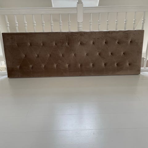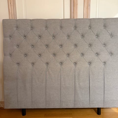 Mio sänggavel i grått tyg med knapptuftad framsida. Gaveln har lätt rundade kanter och står på svarta ben.