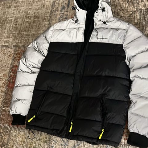 Svart dunjacka med dragkedja fram och på fickorna. Jackan har en hög krage och ribbstickade muddar.