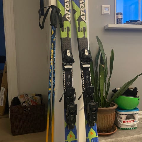Atomic alpinskidor i svart med färgdetaljer. Skidorna har integrerade bindningar monterade. Passar för utförsåkning i pist. Exakt modell, längd och mått framgår inte av bilderna.