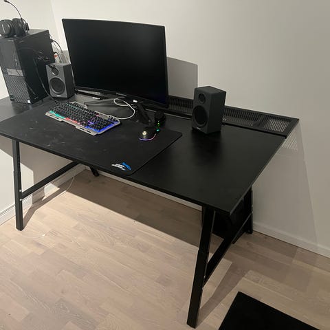 Svart skrivbord. Knappt använd. Förvaring för sladdar.