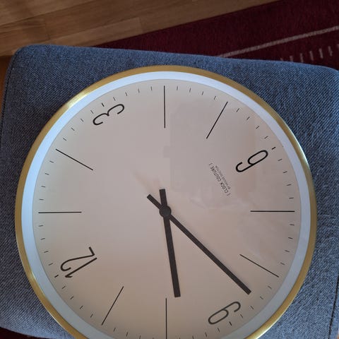 Vägghängd analog klocka i retrostil som använts som inredningsdetalj.