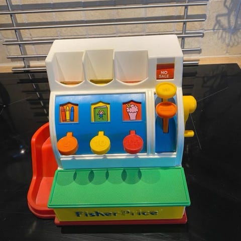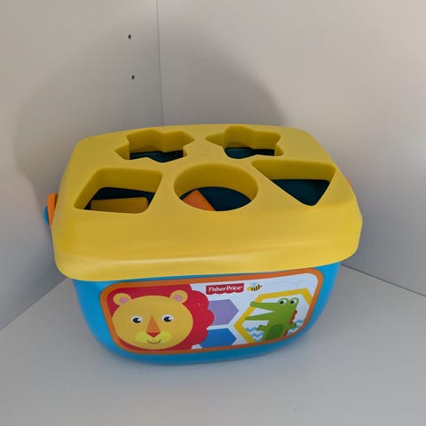 Fisher-Price stapelleksak ringpyramid med flera färgglada plastringar att trä på en konformad pinne. Basen är vit med en gul pinne och ringarna är i olika färger, inklusive en ring som har röd bas och är genomskinlig upptill med kulor inuti. Konen kan skruvas av basen.