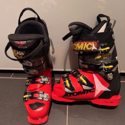 Atomic pjäxor i storlek 28.5–29.0 i röd och svart färg. Pjäxorna har flera justerbara spännen och vadderad insida för stabilitet och komfort. På bilderna syns även skidorna Nordica samt skidstavar, skidglasögon och skidfodral som ingår i utrustningen köpt allt i paketet 2500kr prutat och klart finns i Solna.