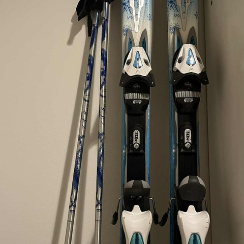 Skidor, pjäxor 28.5–29.0, stavar, skidglasögon.