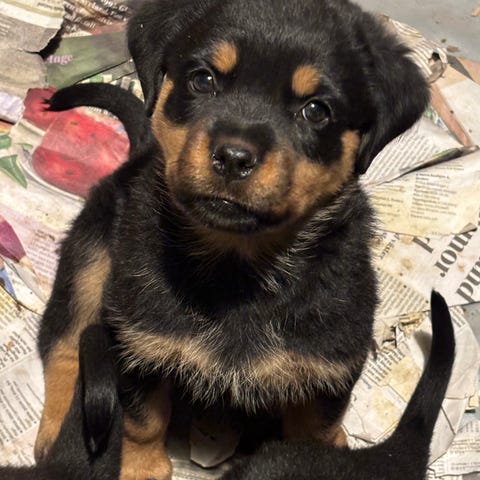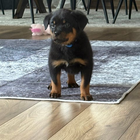 De är en fin blandning av 75 % rottweiler och 25 % border collie. De växer upp i vårt hem med mycket kärlek, närhet och vardagsljud, vilket ger dem en trygg och stabil start i livet.