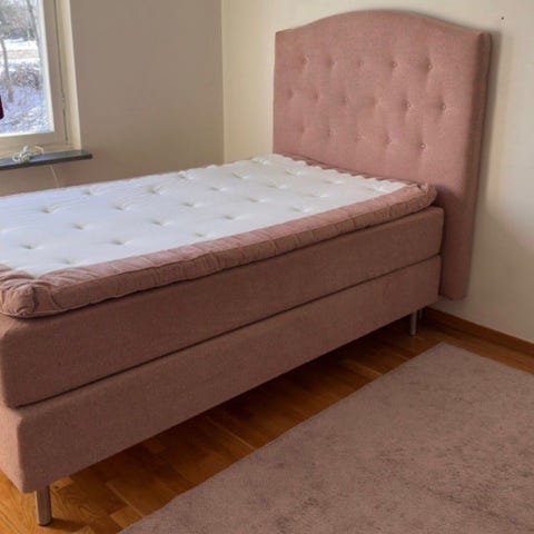 Mio kontinentalsäng i rosa sammetstyg. Sängen har hög, vadderad och knapptuftad gavl samt metallben. Överdelen har en bäddmadrass i ljus färg. Passar som dubbelsäng i sovrum. Exakta mått och modellbeteckning saknas och kan mätas vid behov.
