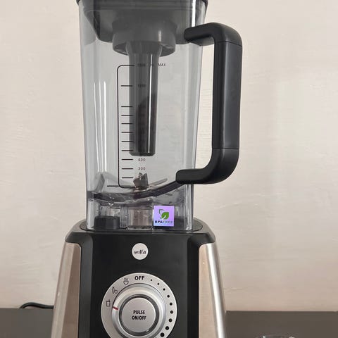 Mycket stark blender från Wilfa. Tre program för iskross, Smoothie och pulserande. 1200 W så stark men också lite högljudd. Mycket stabil glaskanna som går att köra i diskmaskinen. Några år på nacken men varsamt använd. Kanna, knivar, lock helt utan anmärkning. Basen har några fläckar som säkert går bort vid en mer noggran rengöring. Mycket stabil.