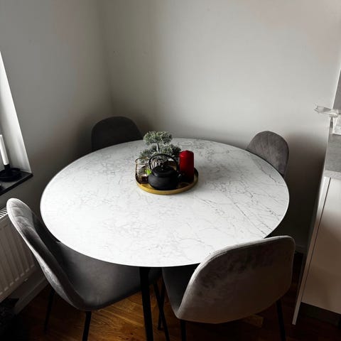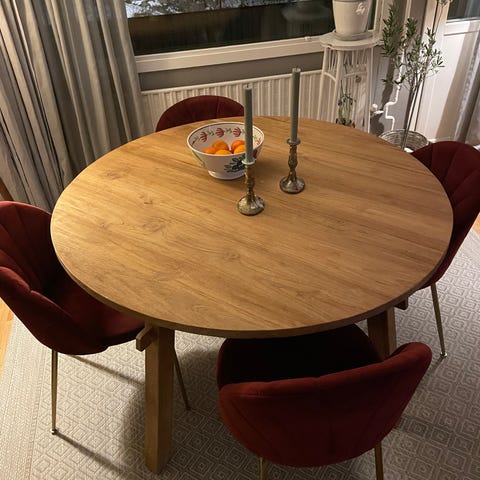 Säljer ett runt matbord med stolar. Fint skick överlag.