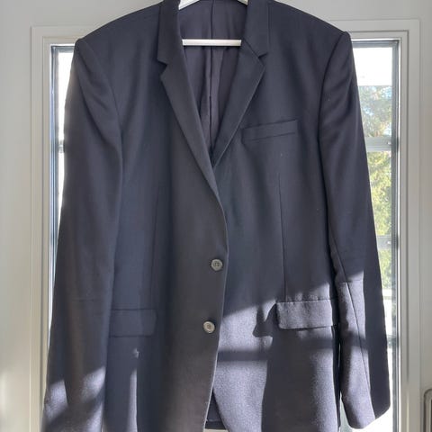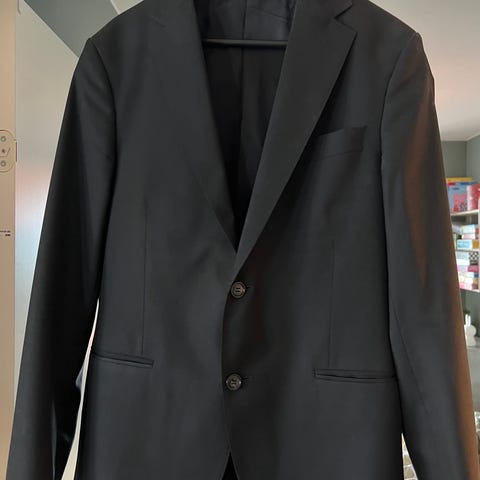 Svart kavaj från Van Gils. Kavajen har två knappar framtill och knappar vid ärmslut. Den har även fickor framtill. Den är en sommar kavaj. material är bomull och flax