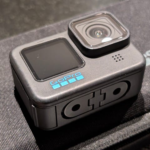 GoPro Hero 10 actionkamera med tillbehör. Kameran är monterad på ett litet bordsstativ/handtag med standard GoPro-fäste.