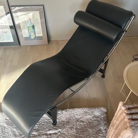 Schäslong av märket SWEEF i skinnimitation. Lätta rivmärken överst på fåtöljen täckta med självhäftande konstläder. För övrigt i gott skick. Finns att köpa i Rönninge.