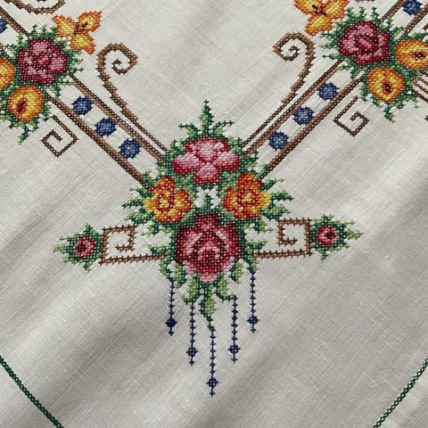 Handbroderad vacker linneduk i bra kvalitet. Blommorna i rosa och röda med vacker spettskant. Känns som ny skick. Mått ca 140x140