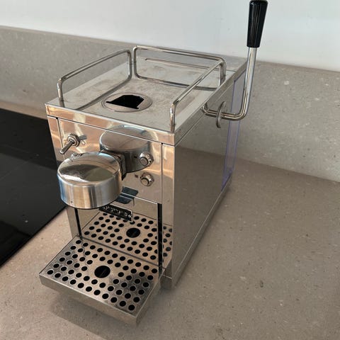 Sjöstrands kaffemaskin i sparsamt använt skick. Behållaren för kaffekapslar är nybytt, då den förra hade fått lite skav på loggan.