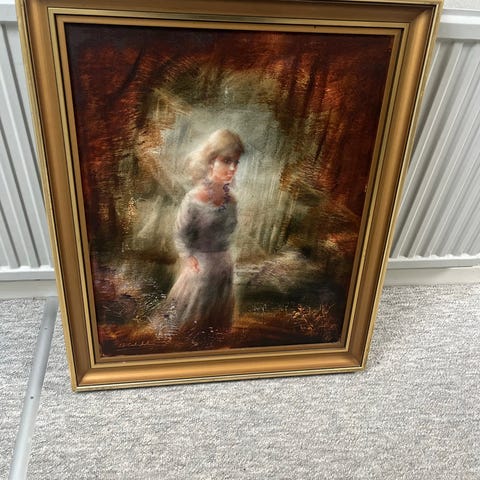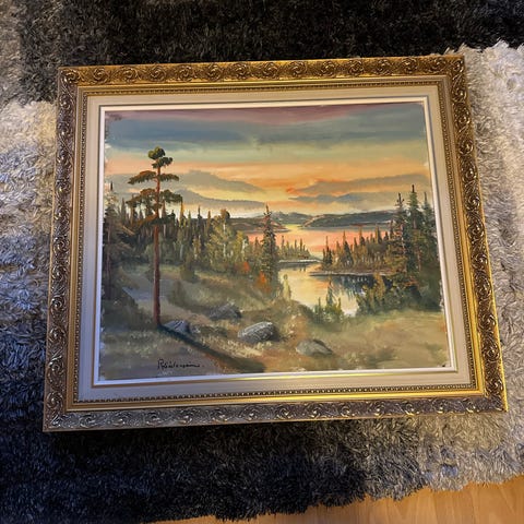 Bertil Böe oljemålning med motiv från Bohuslän. Tavlan föreställer ett kustlandskap med klippor och hav i solnedgång eller soluppgång. Signerad nere i hörnet med texten "Bohuslän" och konstnärens namn samt årtal. Målningen är utförd i olja på duk eller pannå och är monterad i en ljus, profilerad ram med innerlist i grönt. Färgskalan går i gula, blå och brunaktiga toner med tydlig struktur i penseldragen. Passar som väggkonst i vardagsrum, hall eller annat rum där man vill ha ett natur- och havsmotiv.