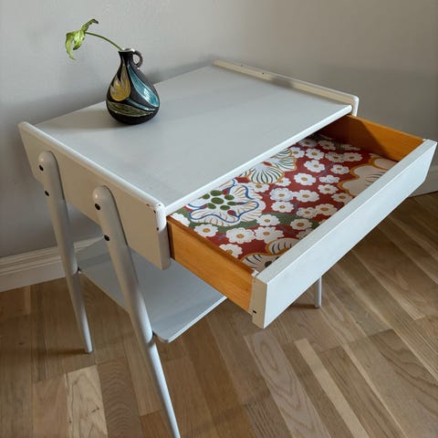 Sängbord / liten byrå / sidobord med tapet från Svenskt tenn (eldblomma Josef Frank). Dekorativt och stilrent.
