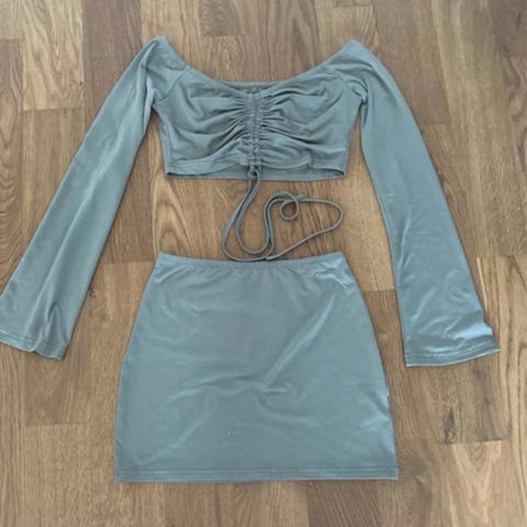 Fashion Nova party-/cocktailklänning för dam i storlek XS. Klänningen är beige och tillverkad i jeans material, Axelbandslös, figurnära modell med enkel, rak nederkant med slits baktill, Passar till fest och andra mer uppklädda tillfällen.